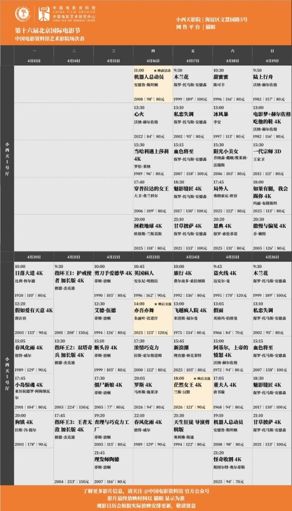 北影节所有场次在猫眼独家售票;电影资料馆日常学术放映可在淘票票、中国电影资料馆APP购票,具体排片见末图,祝大家观影愉快。❤️