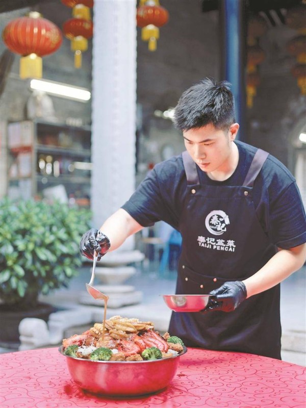 泰记盆菜开在西乡乐群社区郑氏祠堂旁,自祖辈开创至今已有55年。郑嘉聪虽不满三十岁,“盆龄”却已超过20年。