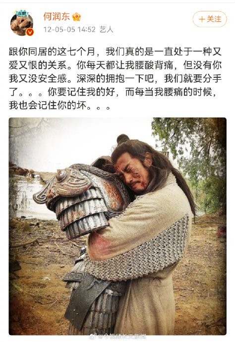 【#何润东 直男写文下手没轻没重#】2012年,何润东结束《楚汉传奇》拍摄后,在微博发长文告别“同居七个月的对象”,描述彼此“又爱又恨”“每天腰酸背痛”“分手拥抱”等暧昧字眼。拟人化的直白吐槽重达40斤的戏服铠甲,被网友调侃为“直男写文典范”——情感丰沛却毫无细腻分寸感。2026年,何润东在古装剧《折腰》中饰演“肩不能扛、手无缚鸡之力”的文弱书生,当他一脸严肃念出“我未曾习武”的台词时,反差画面引来网友的细心考古,“直男写文”梗二次发酵。(北青娱见) #孙俪儿子画个妆直接能演甄嬛了##窈窈有期 硬刚爱奇艺##爱奇艺CEO龚宇发声##月鳞绮纪鞠婧祎戏服卖掉了##张翰就医后前往移民局##张凌赫登上法国第一大报纸##无畏闫桉源无获转场#
