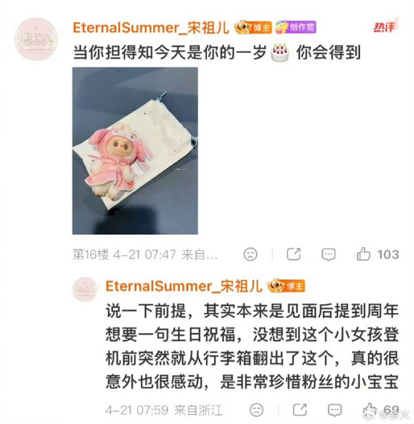 宋祖儿为粉丝站庆周年赠送礼物