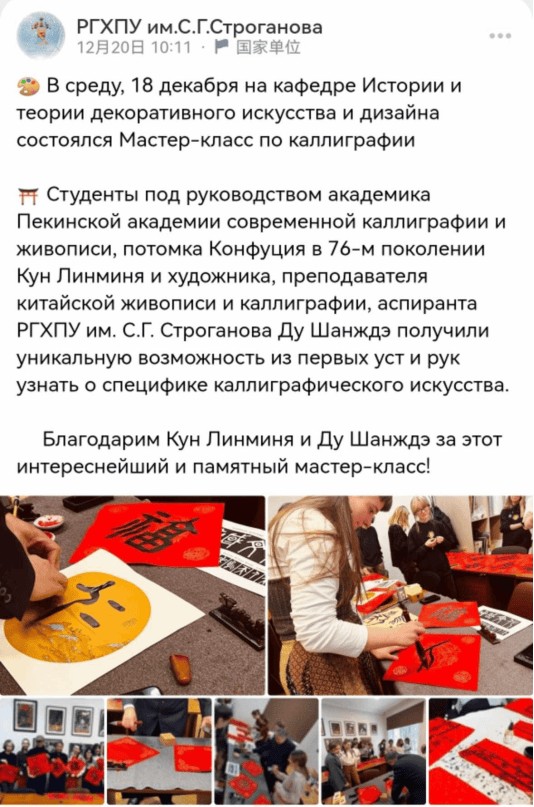 谈及自己在俄罗斯期间的经历,杜尚劼老师表示:“作为一名山东商务职业学院的专任教师,我始终牢记教书育人与文化传播的双重使命。能够在异国他乡用艺术搭建中俄友谊的桥梁,让更多俄罗斯朋友了解中国书画之美,同时也为中国石油海外员工送去精神食粮,我感到无比荣幸。这些实践不仅丰富了我的人生阅历,更让我深刻体会到,文化交流需要脚踏实地的行动。未来,我将把在俄罗斯积累的经验带回学校,融入课堂教学,培养更多具有国际视野和文化自信的青年人才,为山东职业教育的高质量发展和中俄人文交流贡献自己的一份力量。”
