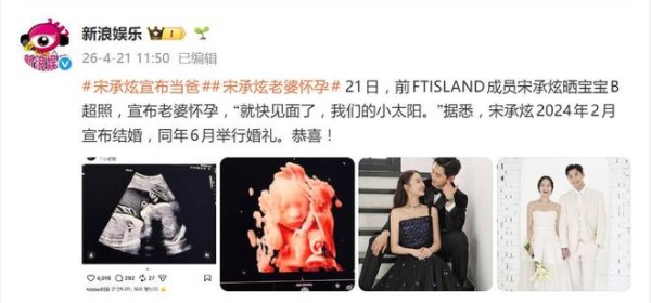 据4月21日报道,前FTISLAND吉他手宋承炫在社交平台甩出一张宝宝B超照,正式官宣妻子怀孕。他配文写道:“就快见面了,我们的小太阳。”照片里,黑白B超和清晰的3D彩超并列,胎儿轮廓已然可见,字里行间全是掩不住的期待和幸福。