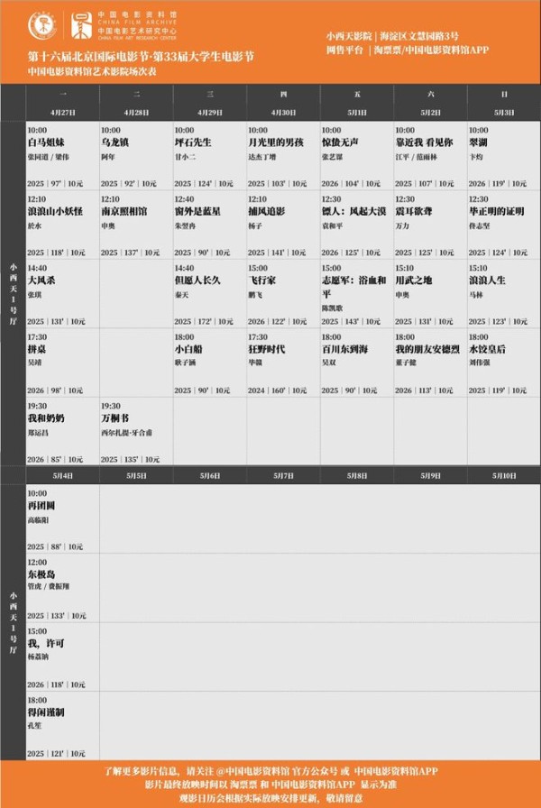 北影节所有场次在猫眼独家售票;电影资料馆日常学术放映可在淘票票、中国电影资料馆APP购票,具体排片见末图,祝大家观影愉快。❤️
