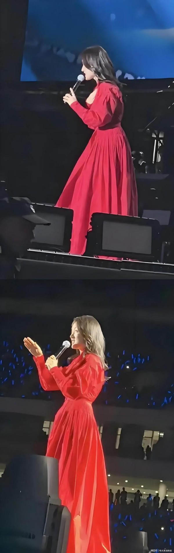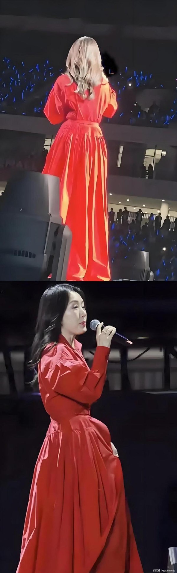 当天她选了一身大红色束腰长裙亮相,裙身是蓬松的廓形设计,从肩颈到脚踝包裹得严实,原本是想来个庄重又喜庆的舞台造型,没想到在路人的生图镜头里,效果却打了折扣。毕竟已经54岁,身形比年轻时圆润了不少,蓬松的裙摆反而放大了腰胯的宽度,从背后望过去,肩背线条显得有些厚重,难免给人几分臃肿的观感。