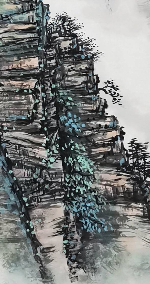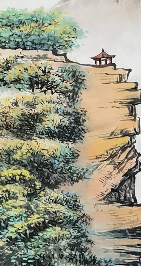 崖顶孤亭、山间林木点缀其间,于壮阔山河中融入人文烟火,动静结合、情景交融,突破传统北派山水重气势、轻意境的局限,格局开阔,韵味悠长。